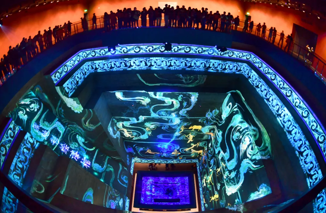 湖南博物院通过多媒体技术,运用多台投影融合,以声光的震撼效果,向观众展示了汉代棺椁陈放设置、汉代生活方式和丧葬观念。湖南日报全媒体记者 郭立亮 摄