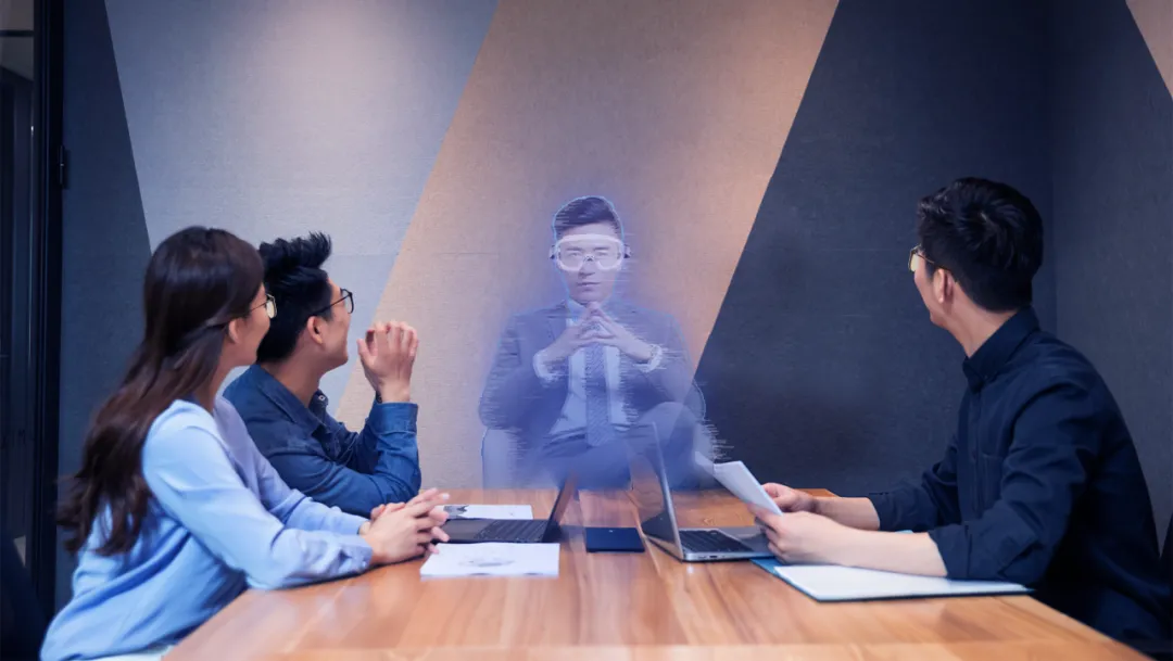 马栏山视频文创园平行视界项目概念图。通过该项技术,身处异地的双方戴上专用眼镜后,不仅能“面对面”畅聊,还可以演示PPT,看电影。企业供图