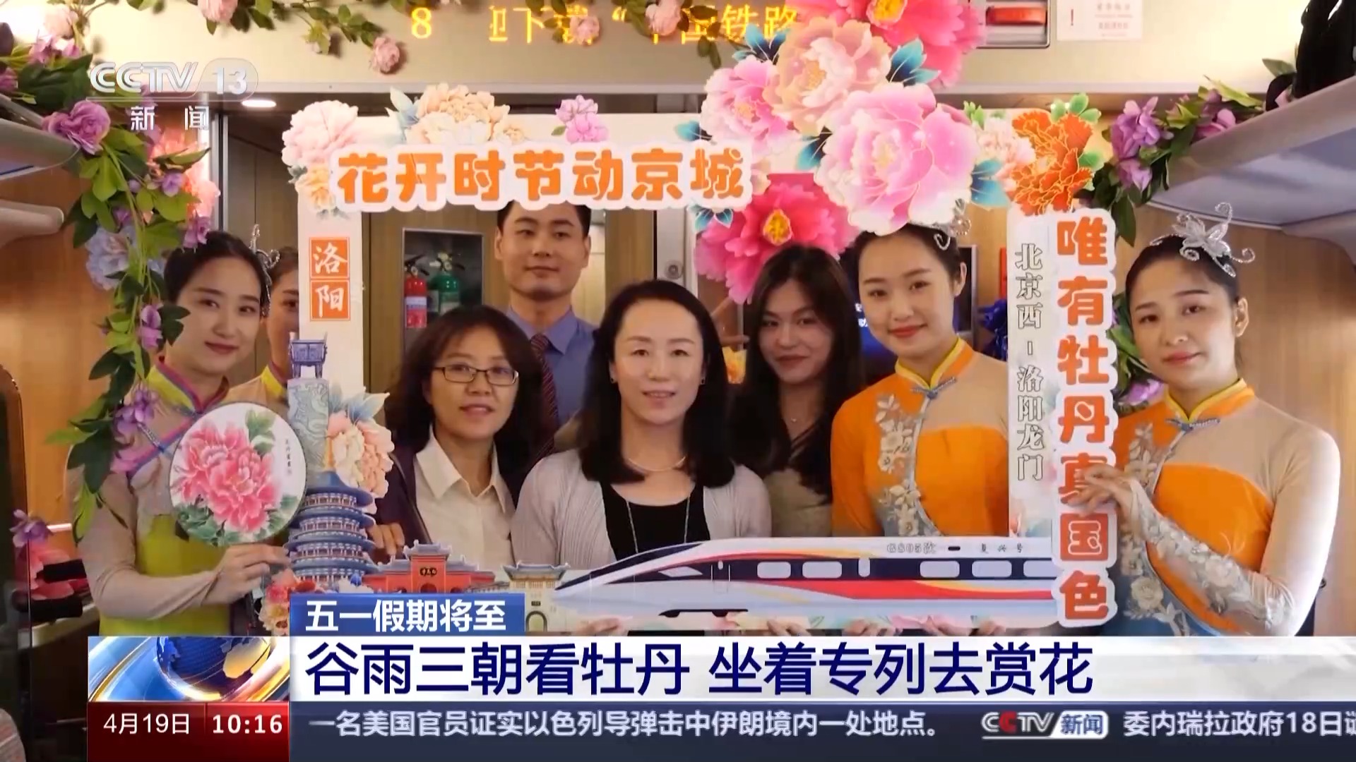 总台记者 齐鹤: 北京西开往洛阳的赏花专列,3小时左右就可以到牡丹花开的城市,在这趟列车上,也能感受到很多与牡丹相关的体验。大家在专列可以看到主题车厢限定福利——“大美中国·国风牡丹”文艺演出,汉服牡丹舞、牡丹秀、牡丹诗词朗诵等活动,让列车员和乘客在列车上展开关于牡丹文化的互动,让乘客沉浸式体验此刻洛阳的风土人情。