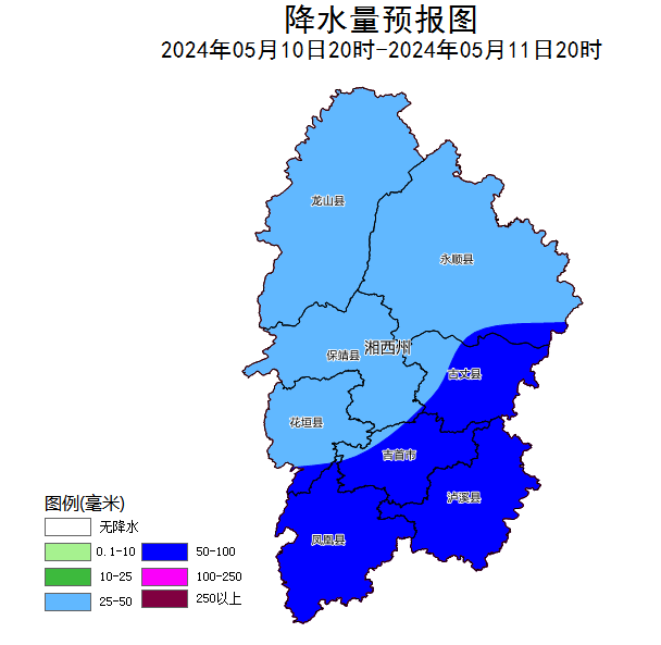 强降水及强对流落区主要在:泸溪县、凤凰县、吉首市、湘西高新区、古丈县大部、永顺县南部、花垣县南部。