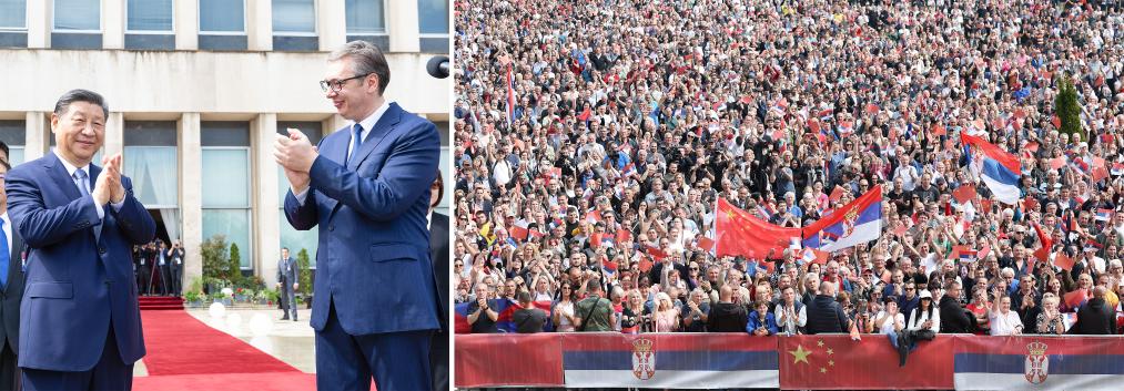 “习近平主席,我想告诉您的是,您受到全世界人民的尊重,塞尔维亚人民对您的爱戴是发自肺腑的。”塞尔维亚总统武契奇在欢迎仪式上说。上万人的欢迎人群中,竖起紧紧连在一起的五星红旗和塞尔维亚国旗,是中塞铁杆情谊的生动见证。
