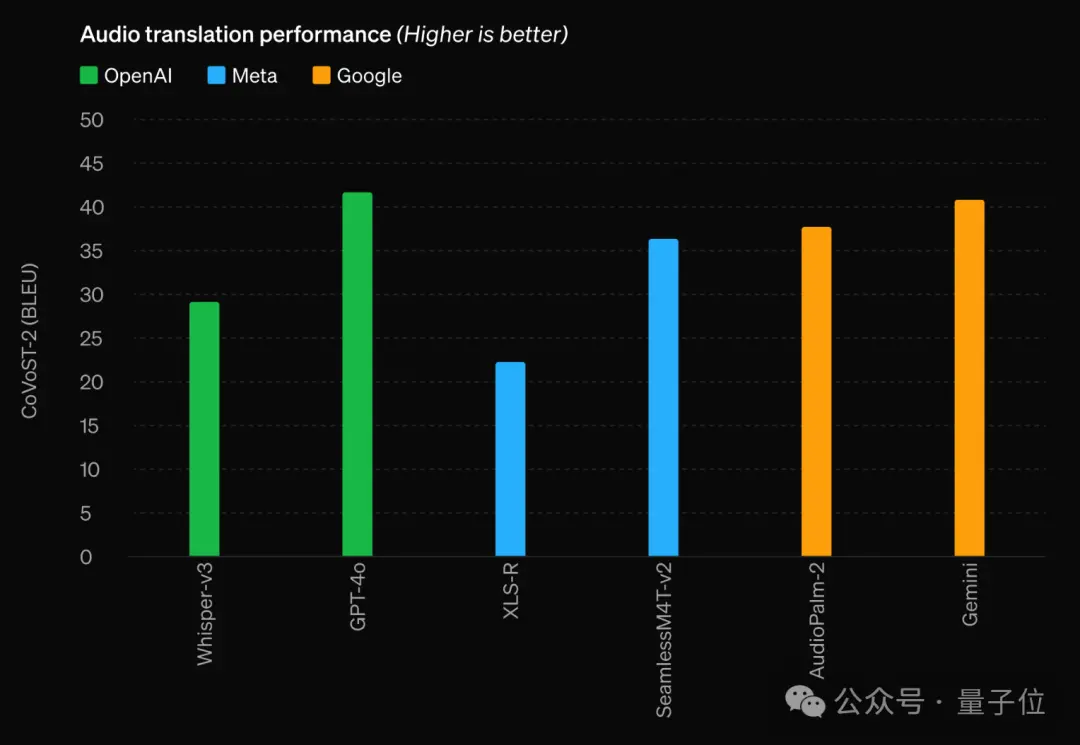 在语音翻译任务上,强于OpenAI专门的语音模型Whisper-V3以及谷歌和Meta的语音模型。