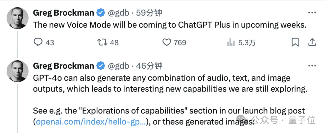 最后视频以Brockman唱出的一句Thank you结束,在视频外的推文中他还透露新的语音对话功能将在数周内向Plus用户开放。