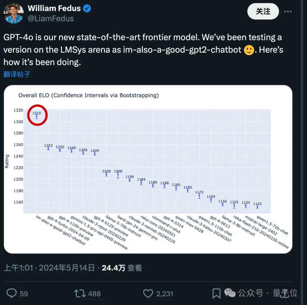 在场外,研究员William Fedus揭秘,GPT-4o就是之前在大模型竞技场搞A/B测试的模型之一,im-also-a-good-gpt2-chatbot 。