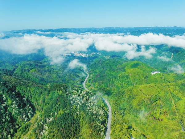 5月13日,吉首市红山国有林场附近云雾萦绕山间,连绵的青山苍翠欲滴,呈现出一幅绿意盎然的自然生态画卷。