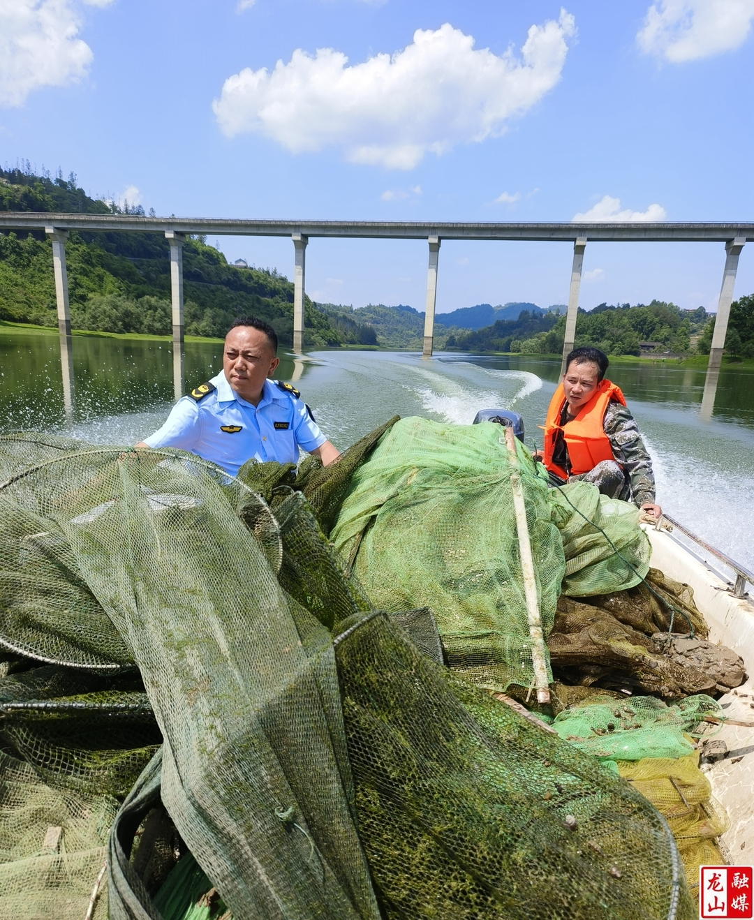 龙山县融媒体中心5月24日讯(通讯员 彭彪 沈轩)5月23日,洗洛镇综合行政执法大队、镇河长办接到群众举报:湾塘河段存在非法网鱼及禁钓区违规垂钓等行为。镇综合行政执法大队、镇河长办立即赶到现场对违法违规行为进行严厉打击,当场收缴渔网1张、地笼20余副、钓具若干。