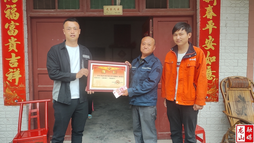 “贾涛同志在2023年度工作中表现突出,被表彰为东海尖兵(三级表彰),特此报喜。”退役军人服务站工作人员为家属递上了喜报和奖金,对现役军人守大家舍小家的爱国情怀和刻苦训练守护国门的勇敢坚毅表示崇高的敬意,对家属坚定支持和默默付出表示真诚的感谢,希望他们一如既往地鼓励孩子扎根部队,争取再立新功,为家乡争光,为国防建设作出新贡献。