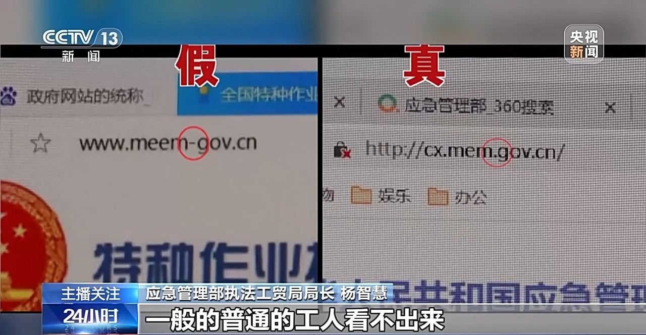 应急管理部执法工贸局局长 杨智慧:假网站它的服务器多数还在境外,查起来,难度非常大。假冒网站点击进去,证书在这个网站上查询,一般的普通的工人看不出来,所以我们需要加大宣传的力度。