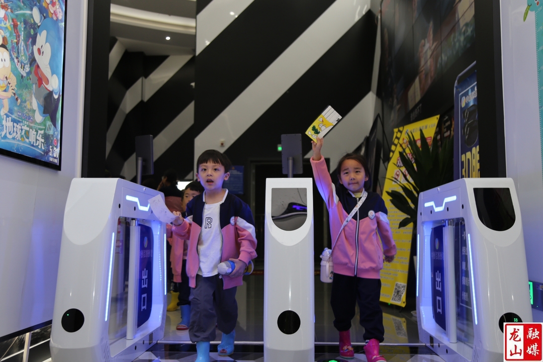 活动中,大班的哥哥姐姐扮演起检票工作人员,引导弟弟妹妹们有序入场。孩子们被电影中的故事情节深深吸引,不时发出阵阵欢笑声。