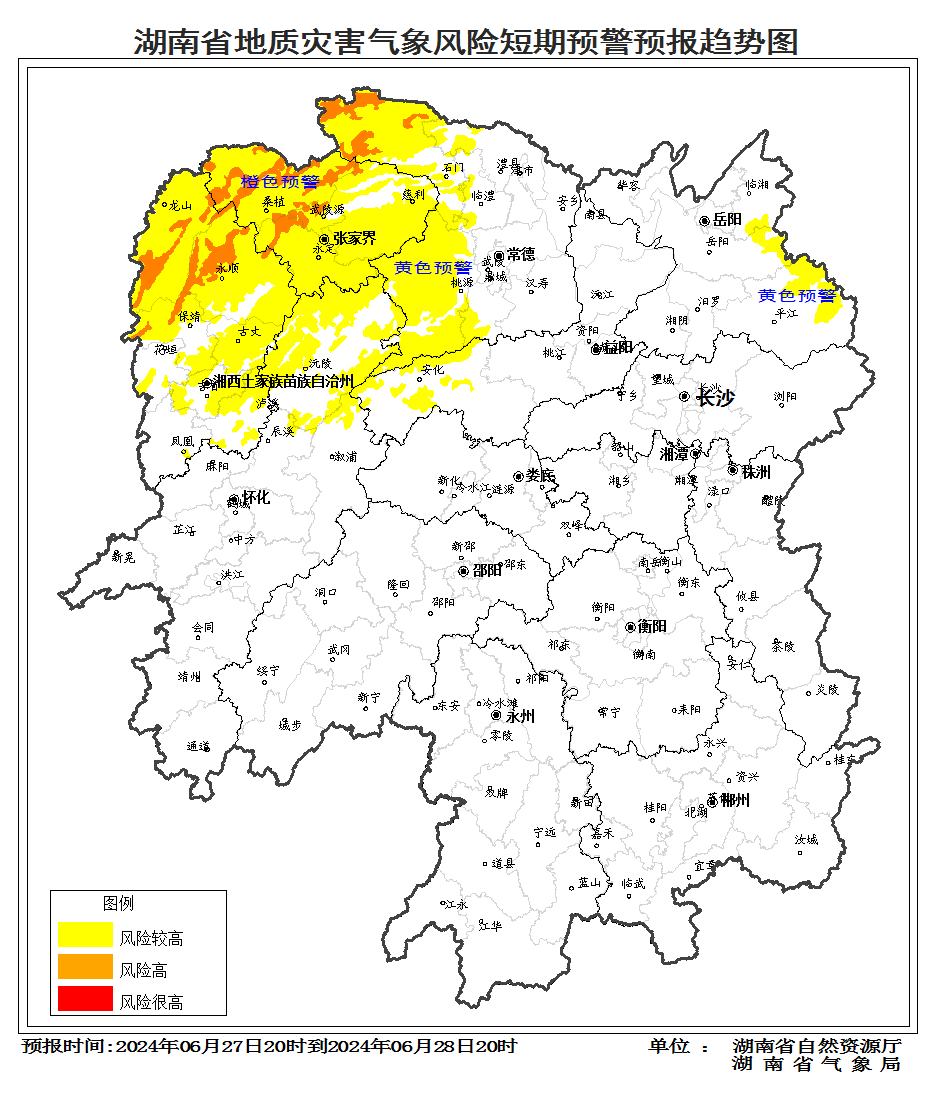 根据地质灾害成灾规律和孕灾条件,结合2024年6月27日短期气象预报情况,省自然资源厅与省气象局联合会商得出如下结论:自6月27日20:00至28日20:00,受降雨影响,湘西北部分区域发生突发性地质灾害风险高(橙色预警),湘东北、湘西北大部分区域发生突发性地质灾害风险较高(黄色预警)。