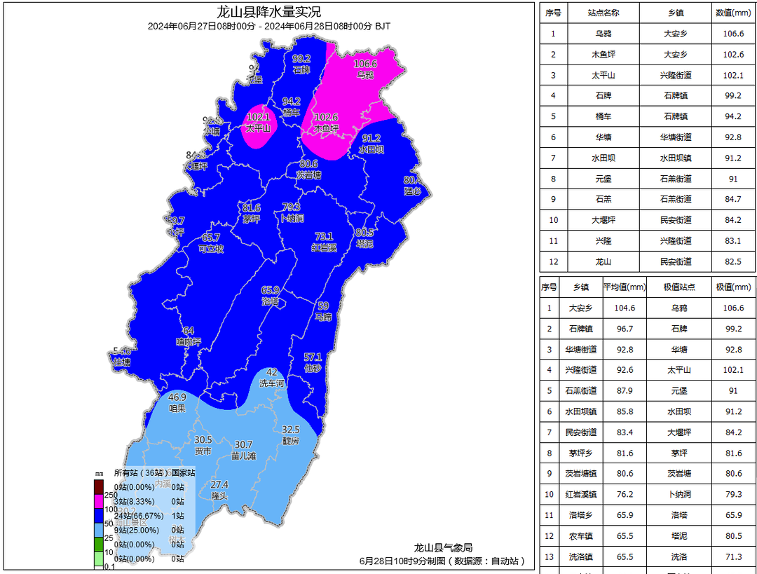 6月27日08时至28日08时我县中北部普降暴雨,局地大暴雨,南部降大雨,平均降水量为68毫米,其中大雨9站,暴雨24站,大暴雨3站(大安乌鸦106.6毫米、大安木鱼坪102.6毫米,太平山102.1毫米)。