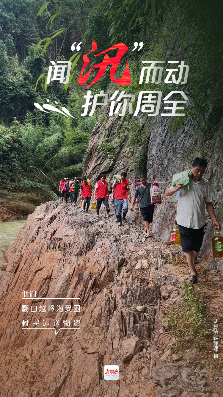 6月25日,桃源县夷望溪镇竹园村,志愿者队伍肩挑手提为受困村民运送应急物资。