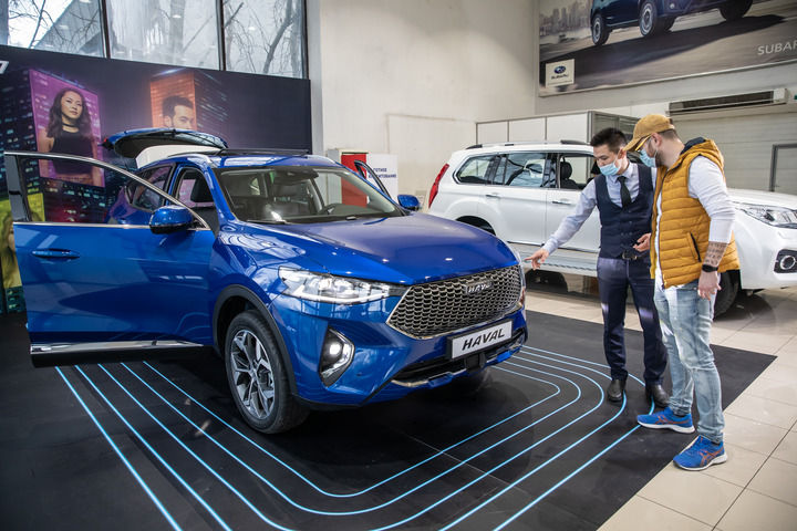2021年4月1日,销售人员在哈萨克斯坦阿拉木图市经销商店向消费者介绍哈弗汽车。 新华社发(阿斯塔纳汽车公司供图)