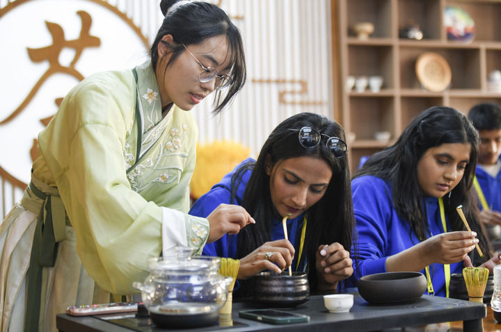 2024年4月15日,参加2024年“汉语桥”上合组织国家青年学生春令营的来华青年学生在新疆师范大学学生(左)的指导下学习茶艺。 新华社记者 王菲 摄