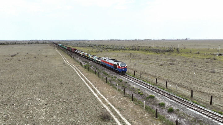 2023年5月12日,在哈萨克斯坦阿拉木图附近,货运列车驰骋于阿拉木图与中国霍尔果斯间(无人机照片)。 新华社发(奥斯帕诺夫摄)
