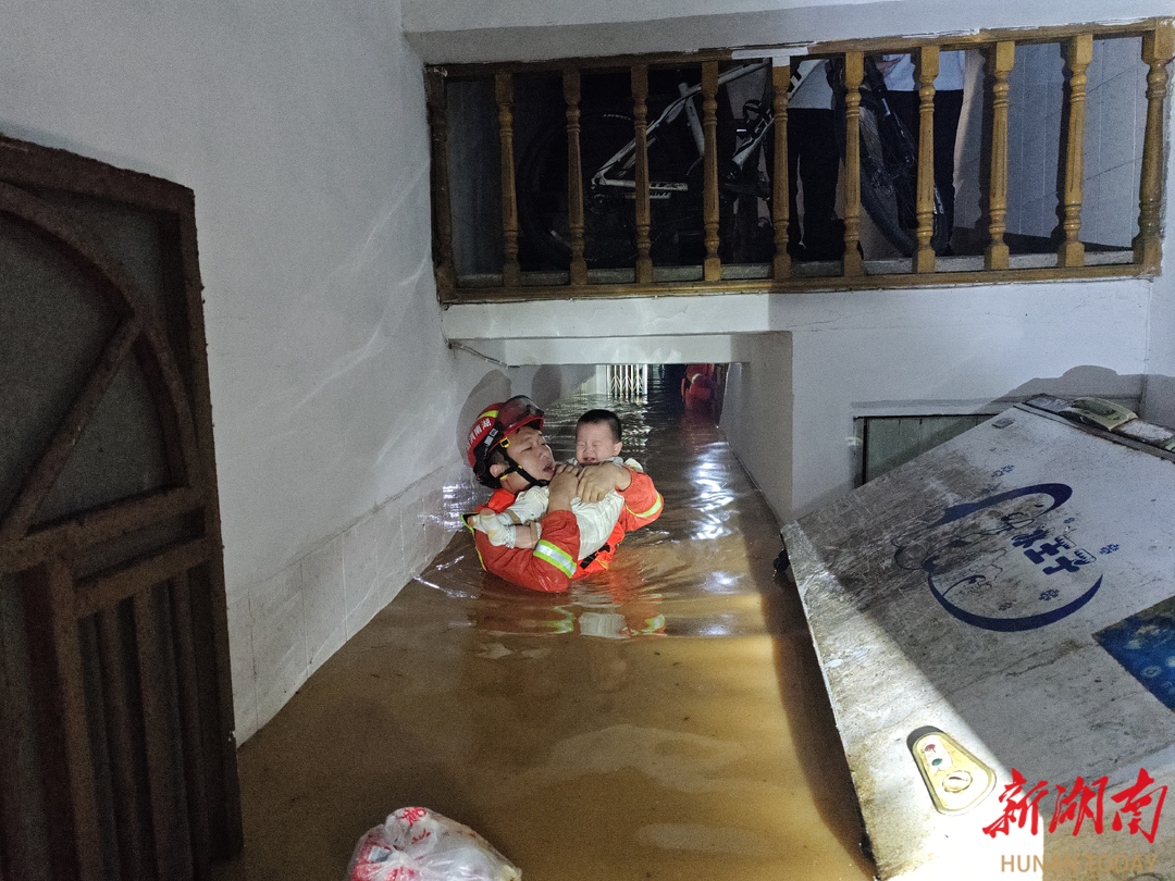 (消防救援队员正在平江转移群众。省消防救援总队供图)