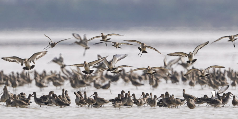 在江西省南昌市,一群黑尾塍鹬在鄱阳湖畔的五星白鹤保护小区上空飞翔(2023年3月10日摄)。新华社记者 周密 摄