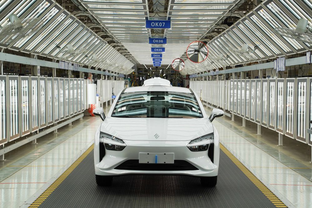 在位于江西省南昌市经开区的江铃集团新能源汽车有限公司生产基地拍摄的汽车生产流水线(2023年7月18日摄)。新华社记者 周密 摄