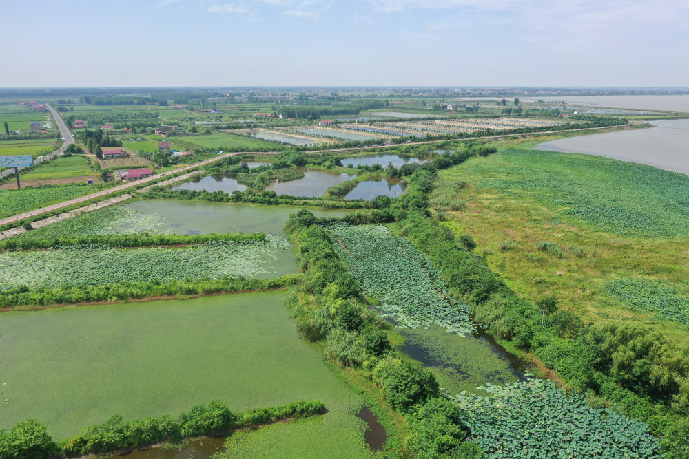 这是在湖南省益阳市大通湖区河坝镇拍摄的由中国科学院设计的大通湖流域农业面源污水末端强化处理设施(2023年7月10日摄,无人机照片)。大通湖地处洞庭湖腹地,被称作“洞庭之心”。新华社记者 薛宇舸 摄