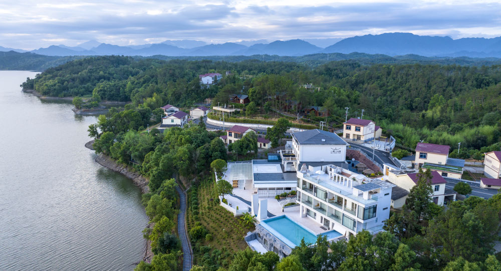 这是江西省武宁县修河畔“一渡一山海”民宿群,一些返乡农民在这里受聘为民宿管家(2024年6月3日摄,无人机照片)。新华社发(梁振堂 摄)