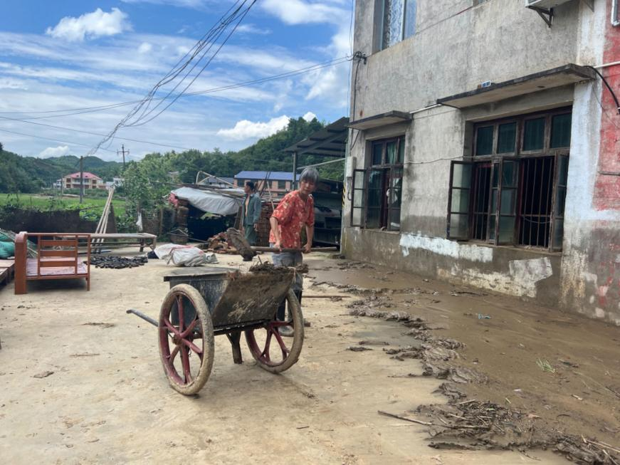 平江县梅仙镇三里村受灾民众在清理家附近的淤泥。杨迅摄