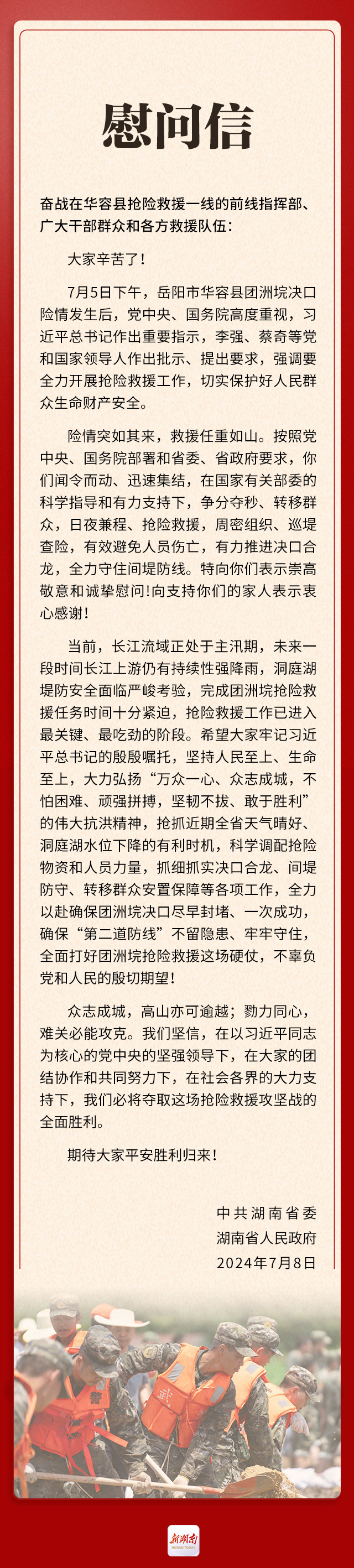 湖南省委省政府向奋战在华容抢险救援一线的全体同志致慰问信