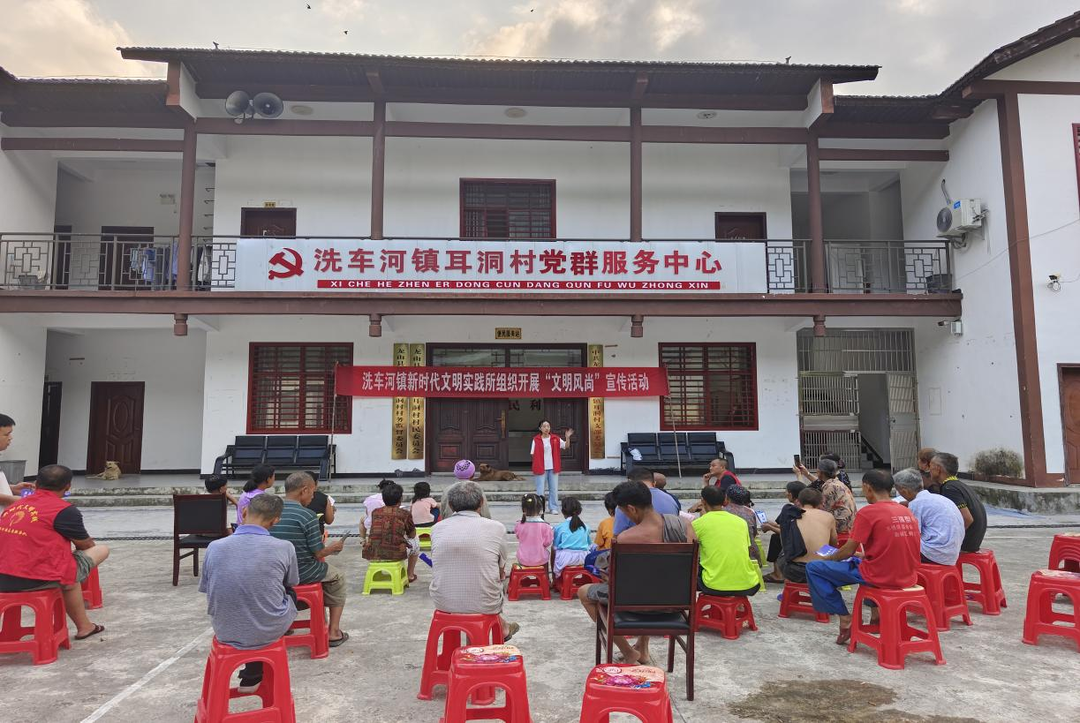 龙山县融媒体中心7月11日讯(通讯员 符慧)7月10日,洗车河镇新时代文明实践所组织党员干部、文明志愿者在耳洞村开展“文明风尚入村寨”志愿宣传活动。