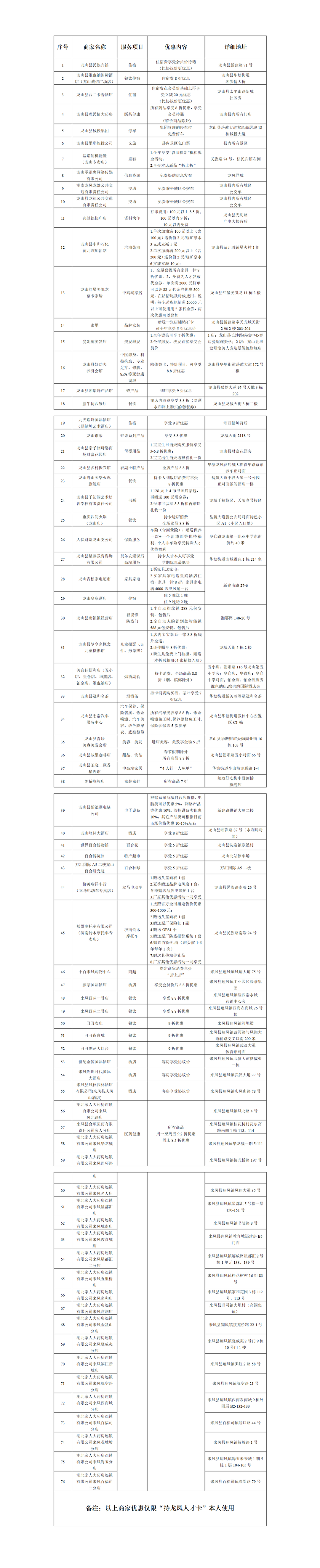 为深入推进龙凤人才区域协作,创优服务人才生态,进一步营造全社会敬才爱才浓厚氛围,切实增强龙山、来凤两县优秀人才的获得感、幸福感,现将第一批“龙凤百名商家服务人才联盟企业”名单公示如下: