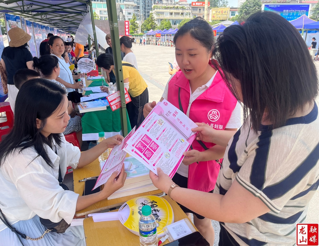 龙山县融媒体中心7月23日讯(通讯员 严丽丽)7月23日,县妇联在县百日千万招聘会现场开展了“建设法治龙山·巾帼在行动”普法宣传活动。