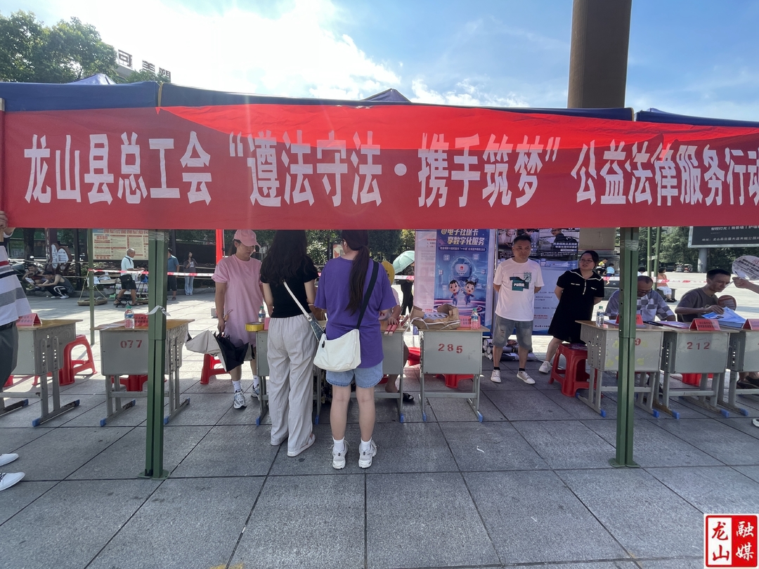龙山县融媒体中心7月24日讯(通讯员 刘玉平 彭召敏) 7月23日,县总工会在百日千万招聘专项行动现场开展“尊法守法·携手筑梦”公益法律服务暨职工创新宣传行动。