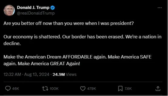 “我们的经济变得支离破碎,我们的边界已经消失,我们的国家正在衰落;让美国梦再次成真,让美国再次安全,让美国再次伟大!”特朗普在贴文中写道。