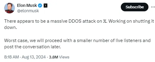 “X似乎遭受了大规模的DDOS攻击,正在努力将其关闭。”马斯克在一篇贴文中写道,此时超过活动预定开始时间大约半小时。马斯克还称,“最坏的情况是,活动继续进行,但将减少实时听众的数量,并稍后发布该对话。”