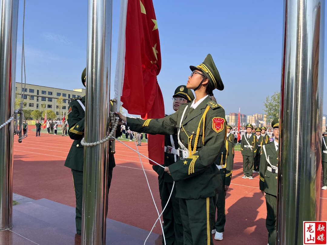 一大早,伴随着嘹亮的国歌声,全体师生及教官面向国旗行注目礼。同学们心潮澎湃,对军训生活充满了向往和斗志。全体新生举起右臂握拳齐眉,用最洪亮的声音和饱满的热情高喊誓词,整个操场回荡着他们铿锵有力的声音,吹响了该校军训的集结号。