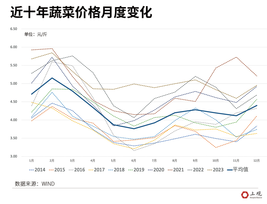 为了搞清楚菜价的变化周期,我们查看了过去多年的数据,发现每年6月蔬菜价格达到年度最低,此后经历一轮上升,到9月份左右开始回落,到11月左右到达又一个低谷。