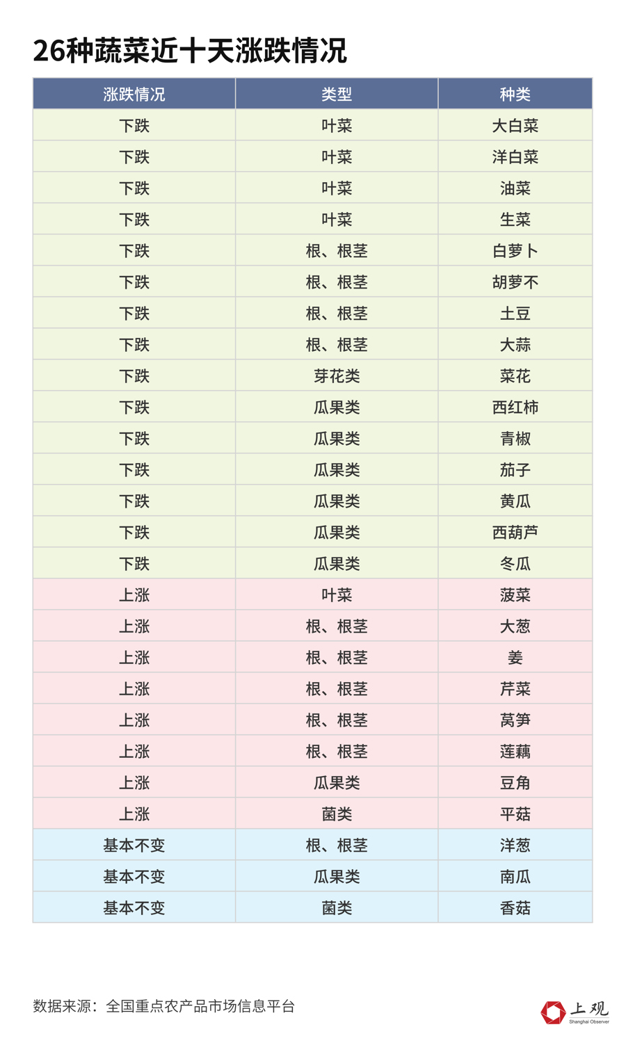 其中,大部分的叶菜和瓜果类蔬菜都处于降价行列中,仍然在上涨的蔬菜则以根茎类蔬菜为主。