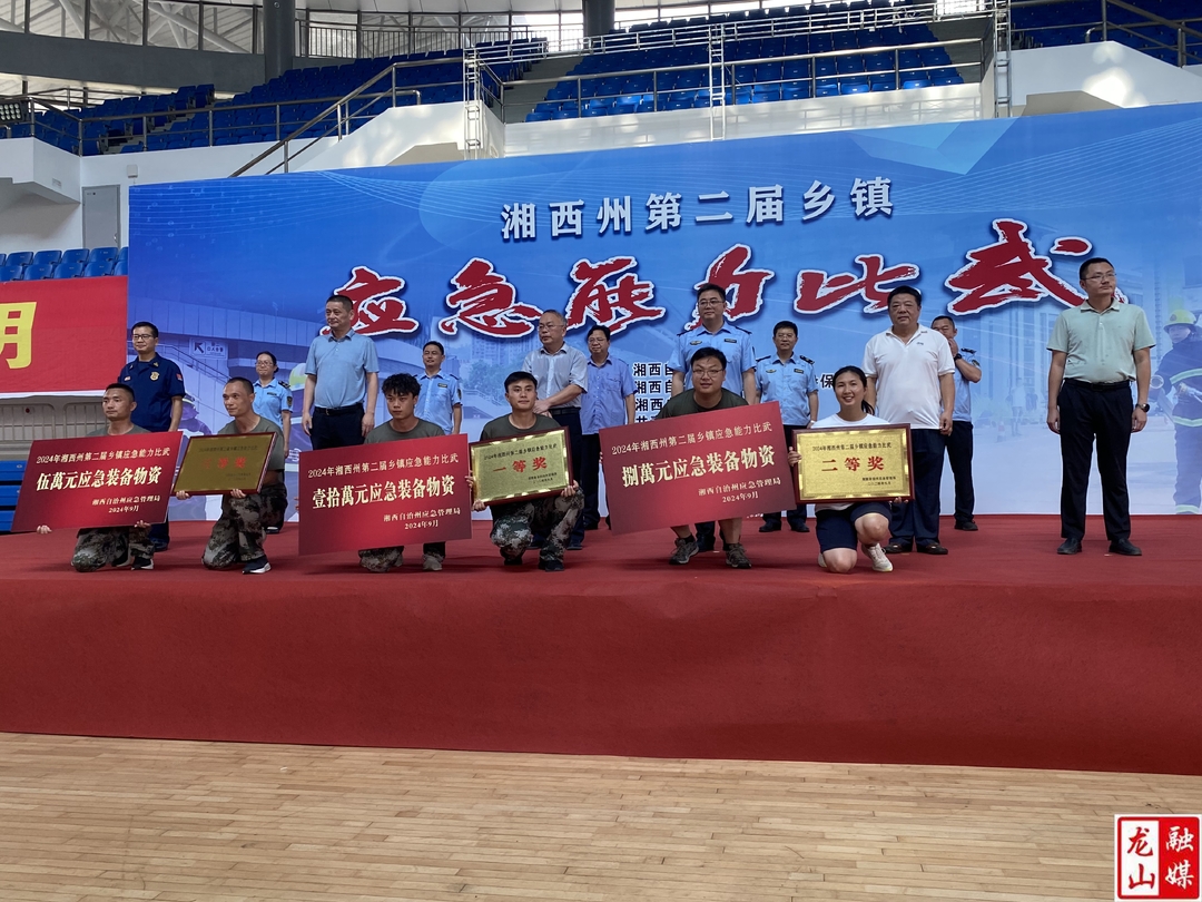 龙山县融媒体中心9月6日讯(通讯员 洪常雄 赵亚珍)9月5日,由湘西自治州应急管理局、人力资源和社会保障局、总工会、团州委、消防救援支队联合举办的湘西州第二届乡镇应急能力比武在湘西民族职业技术学院落下帷幕。全州共8支参赛队伍48名选手参赛,华塘街道应急救援代表队荣获全州集体全能奖第二名,其中队员杨栋、刘柱民分别荣获个人全能奖第三、第四的优异成绩。