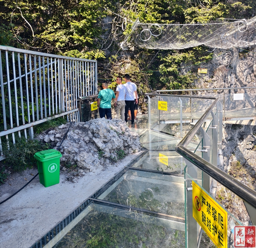 检查过程中,联合检查组不仅仔细检查栈道的结构稳固性,对每一块玻璃、每一处连接点都进行了细致入微的查看,确保没有破损、松动等情况,还对栈道的周边防护设施进行了全面评估,严格检查栏杆高度是否符合标准、防护网是否完好无损。
