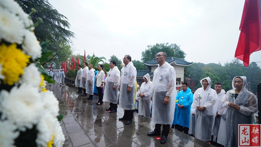 由中共龙山县委、龙山县人大常委会、龙山县人民政府、政协龙山县委、龙山县人民武装部敬献的5个大型花篮一字排开,花篮红色缎带上书写的“革命烈士永垂不朽”熠熠生辉。