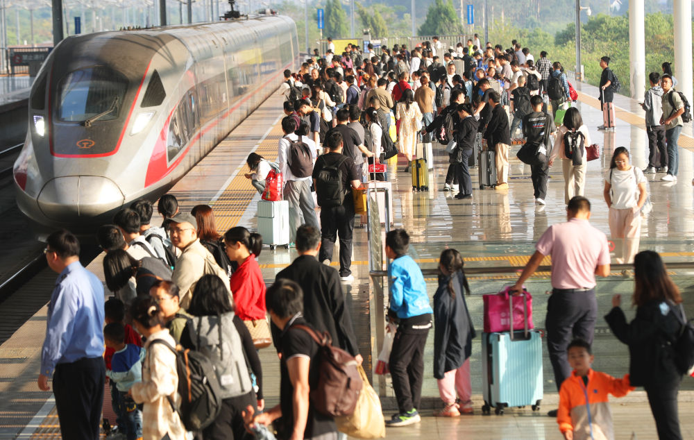 10月6日,旅客在湖南省衡阳东站站台排队乘车。新华社发(曹正平 摄)