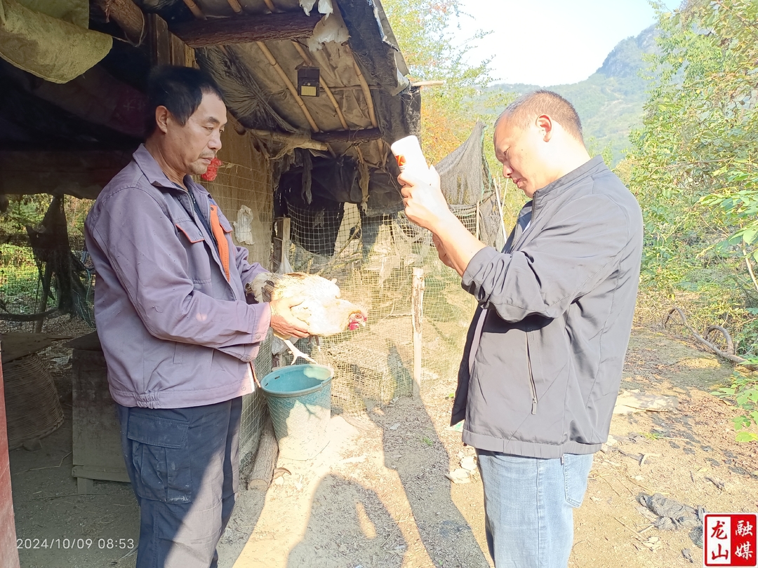 龙山县融媒体中心10月9日讯(通讯员 田佳佳)10月9日,靛房镇畜禽防疫员深入到养殖户家中,开展畜禽防疫工作。此次行动以“镇不漏村、村不漏社、社不漏户、户不漏畜、畜不漏针”为原则,并积极鼓励养殖户自主进行防疫工作。