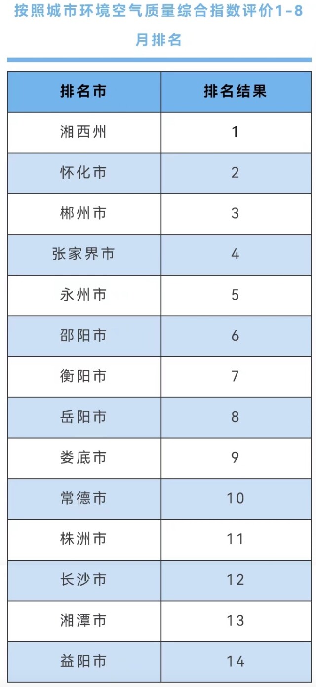 湖南日报10月9日讯(全媒体记者 彭雅惠 通讯员 盛琦)湖南哪里生态环境好?今天,省生态环境厅发布前8个月我省环境质量排名。