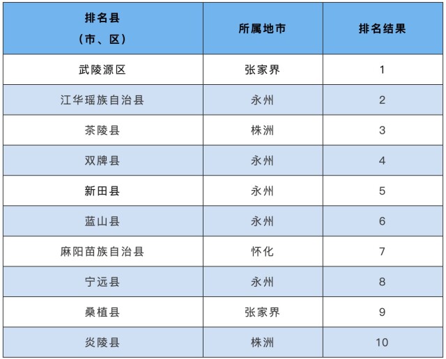 按照城市水质综合指数评价,全省所有县(市、区)中,“水好”前十名分别是张家界市武陵源区、江华瑶族自治县、茶陵县、双牌县、新田县、蓝山县、麻阳苗族自治县、宁远县、桑植县、炎陵县;地表水环境质量较差的十个地区则分别是沅江市、华容县、衡阳县、澧县、蒸湘区、柳叶湖旅游度假区、韶山市、南县、南岳区、大通湖管理区。