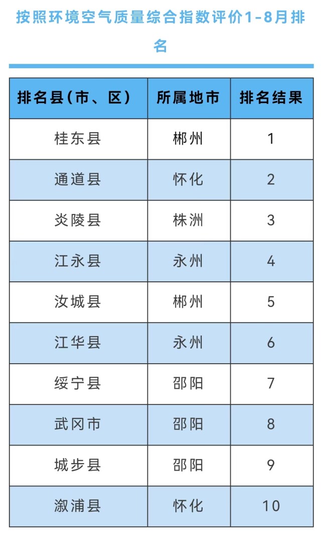 按照空气质量综合指数评价,全省“空气好”前三名的市州是湘西土家族苗族自治州、怀化市、郴州市;娄底市、岳阳市、湘潭市则是空气质量“垫底”市州。空气质量居全省前十的县(市、区)多集中在邵阳、郴州、永州地区,分别为桂东县、通道侗族自治县、炎陵县、江永县、汝城县、江华瑶族自治县、绥宁县、武冈市、城步苗族自治县、溆浦县。