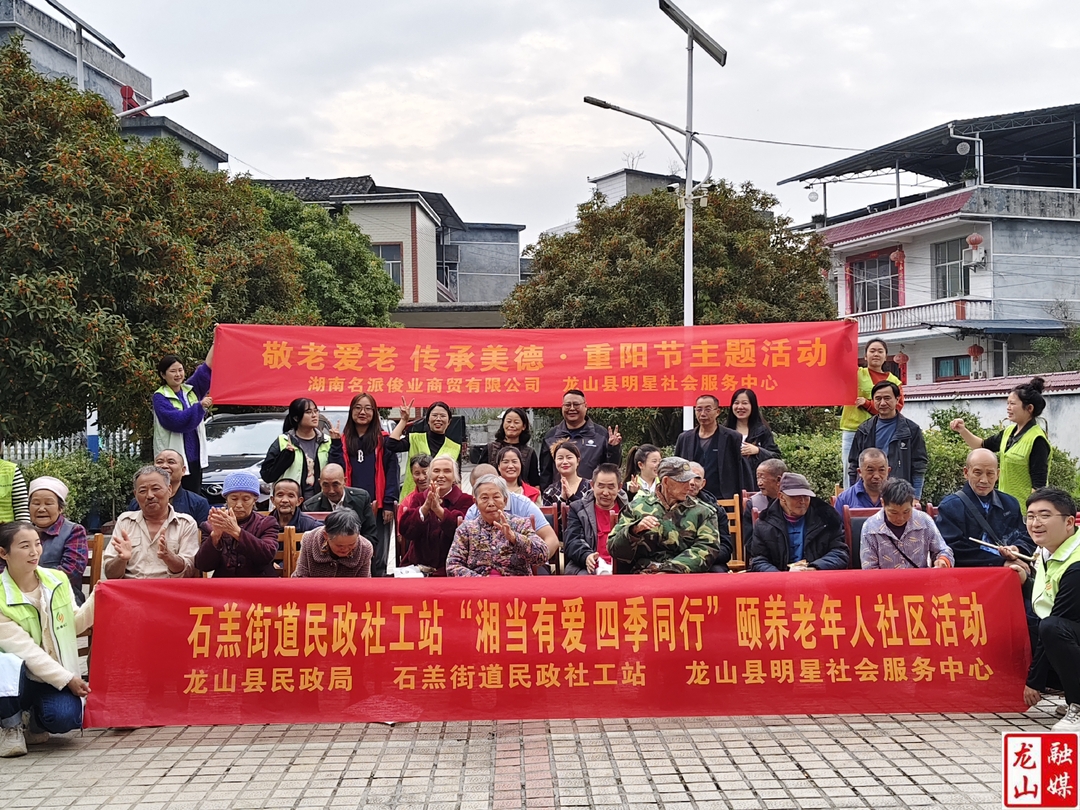 龙山县融媒体中心10月11日讯(记者 刘润)秋风送爽,丹桂飘香。10月11日重阳节当天,龙山县民政社工站、明星社会服务中心、名派俊业商贸有限公司等多方爱心力量来到石羔敬老院,开展了一场温暖人心的走访慰问老人活动。