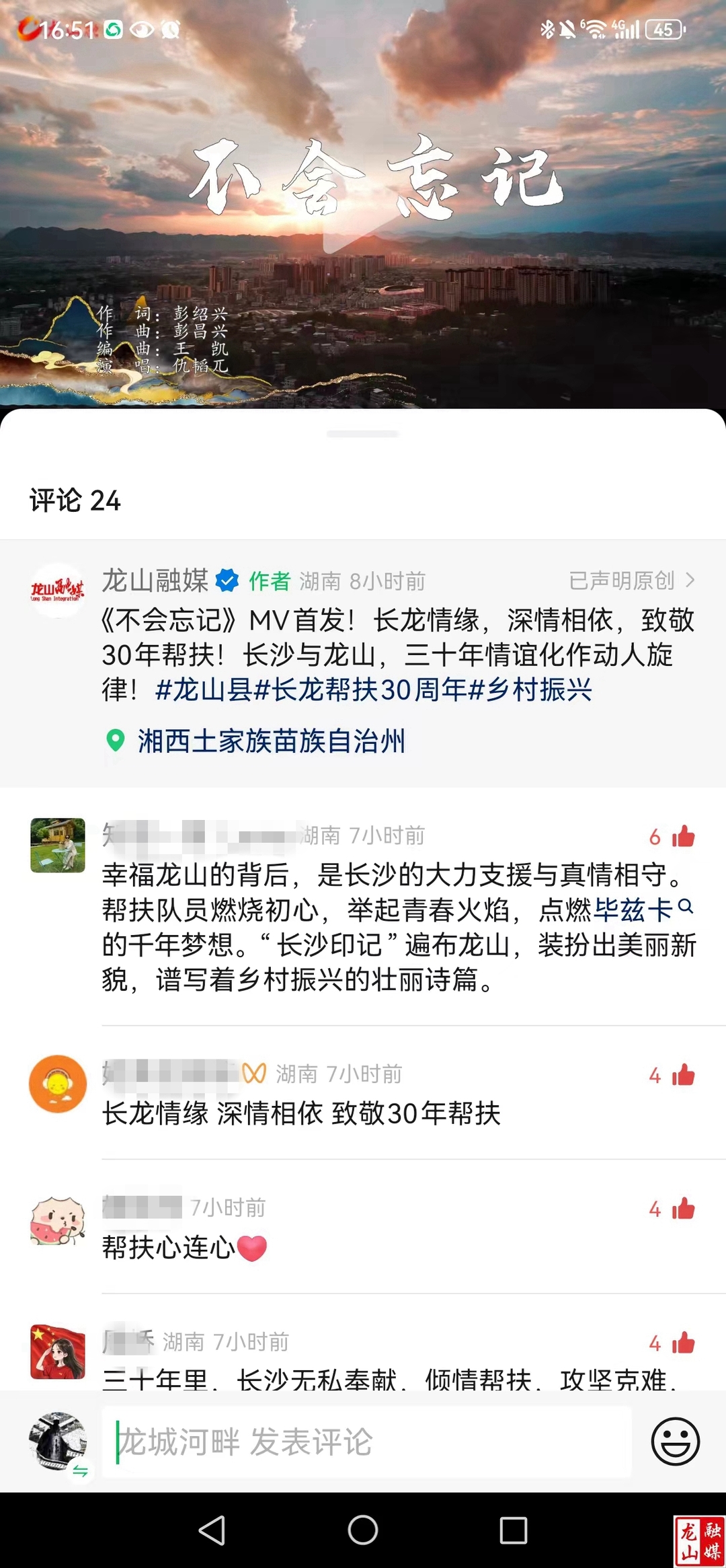 “长龙一家亲,三十年的帮扶岁月,沉淀在龙山的山水之间,如酉水河、八面山;融入土家文化,在西兰卡普、摆手舞中闪耀;更扎根在毕兹卡的心田,在舍巴传唱中永恒。”该县退役军人事务局副局长张海燕在朋友圈转发《不会忘记》MV时,这样配上评论。