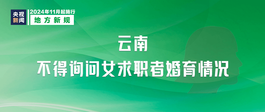 《云南省女职工劳动保护特别规定》11月1日起施行,明确用人单位在招录(聘)过程中,除个人基本信息外,不得进一步询问或者调查女性求职者的婚育情况。