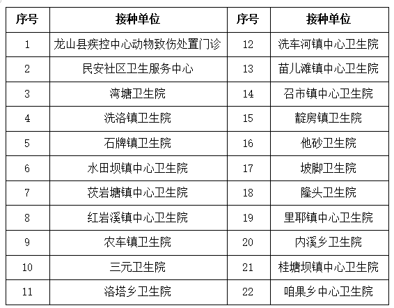 龙山县辖区内开展动物致伤处置门诊(预防接种门诊)名单如下: