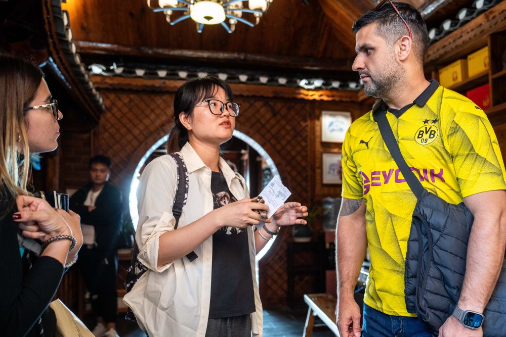 11月7日,在湘西永顺县芙蓉镇景区,张家界国旅国际旅行社的英语导游徐严(中)和外籍游客沟通。新华社记者 陈思汗 摄海外旅行商也瞄准了中国山区旅游市场的“蓝海”。11月7日至9日,第三届湘西州旅游发展大会在永顺县召开,新中毛利少数民族文旅促进会名誉副会长欧拉一行专程从新西兰来到永顺签署合作协议。