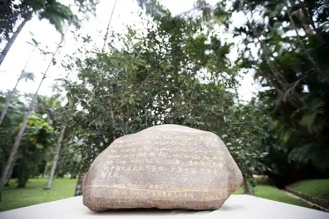 △巴西里约热内卢植物园,来自中国福建的华安石纪念牌记载:“1812年,首批抵达巴西的中国人在此栽下茶树”。