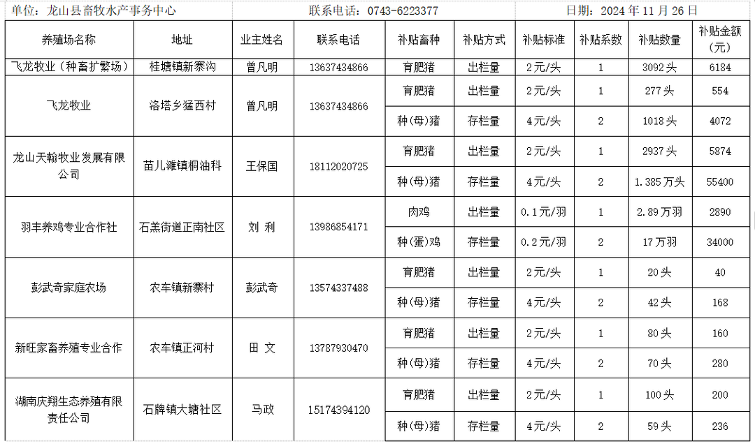 龙山县2024年规模养殖场畜禽强制免疫“先打后补”补助资金的公示